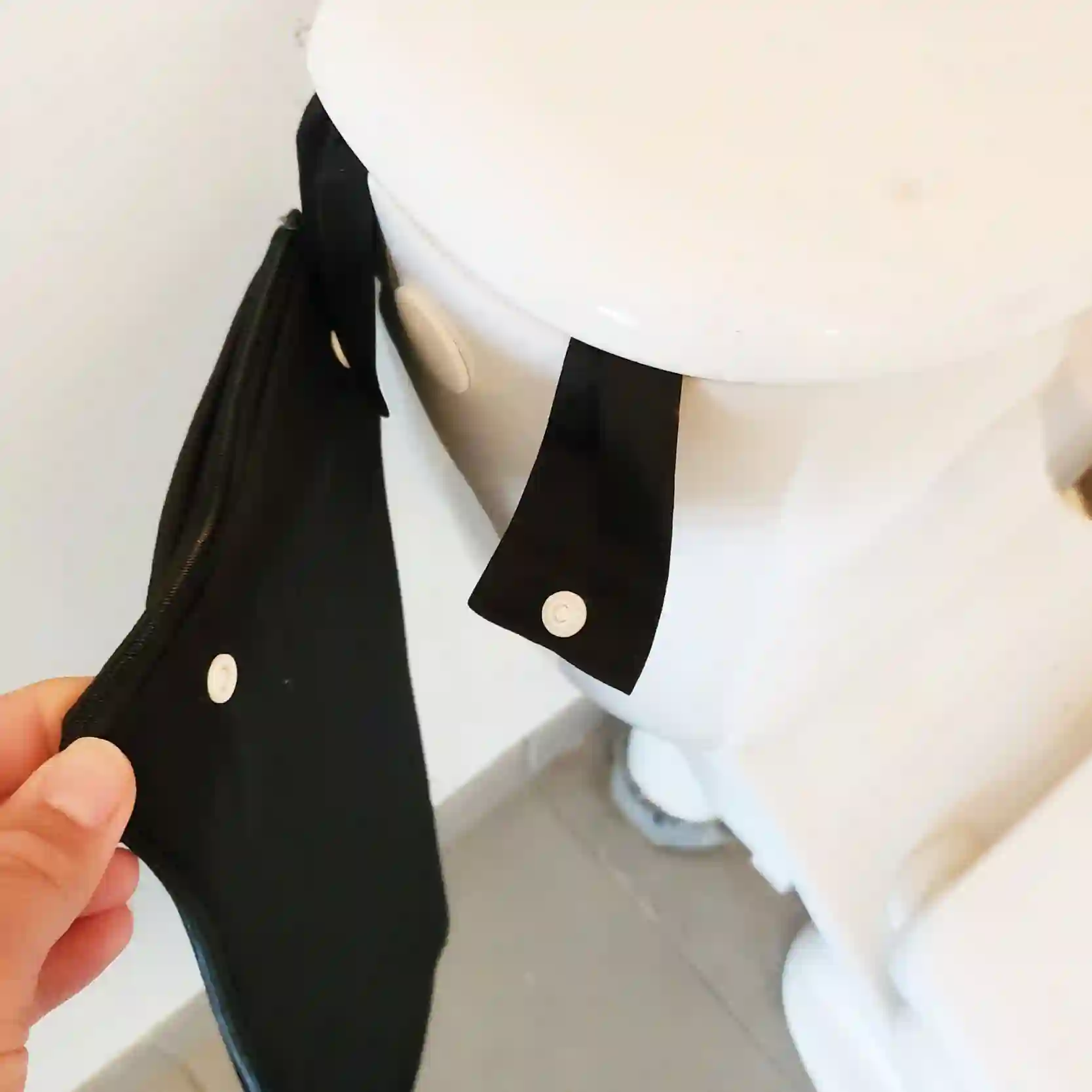 Pratique il se fixe sur la cuve des toilettes grâce à son système de nœuds. Une fois placée (à faire 1 fois uniquement), vous déclipez les pressions pour le déplacer jusqu’à la machine à laver.