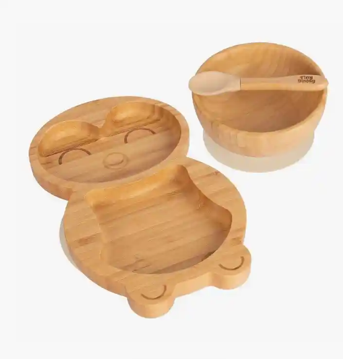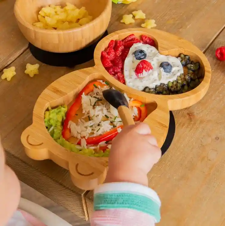 L’assiette à ventouse en bambou de la gamme Tiny Dining est idéale pour accompagner les repas des tout-petits en pleine exploration.