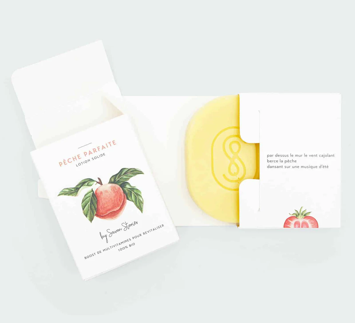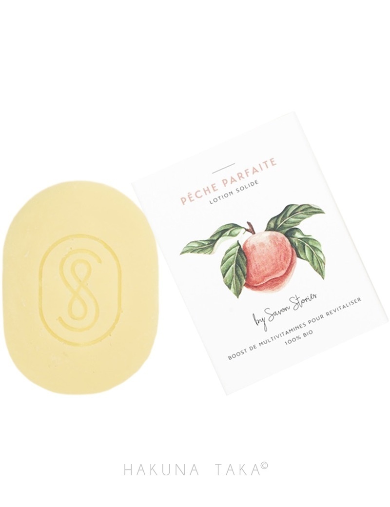 La lotion solide “Pêche Parfaite” de la marque Savon Stories est riche en multivitamines et acides gras, offrant une nutrition intense et une revitalisation de la peau.