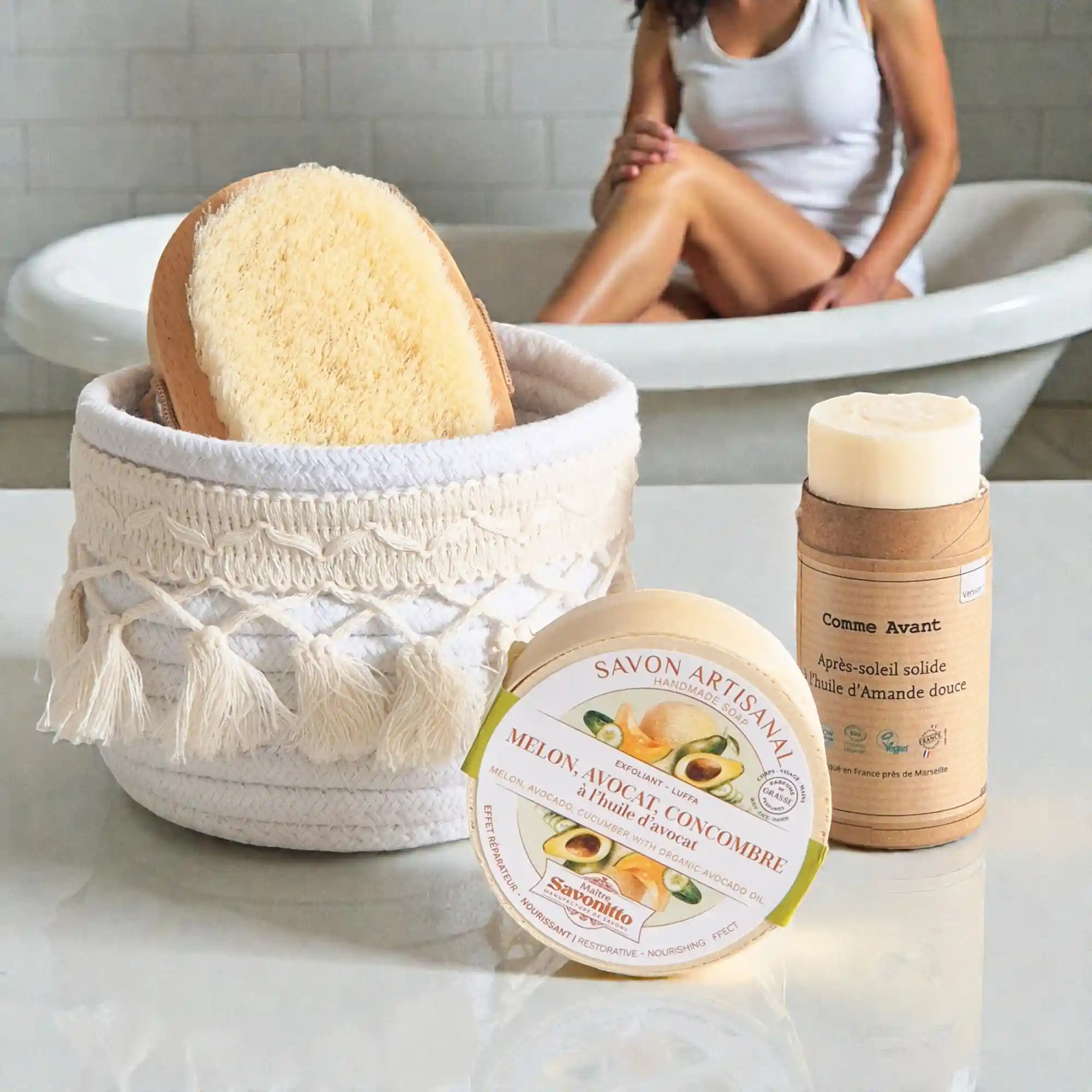 - Luffa naturelle : exfolie en douceur, élimine les impuretés et stimule la circulation pour une peau plus lumineuse.