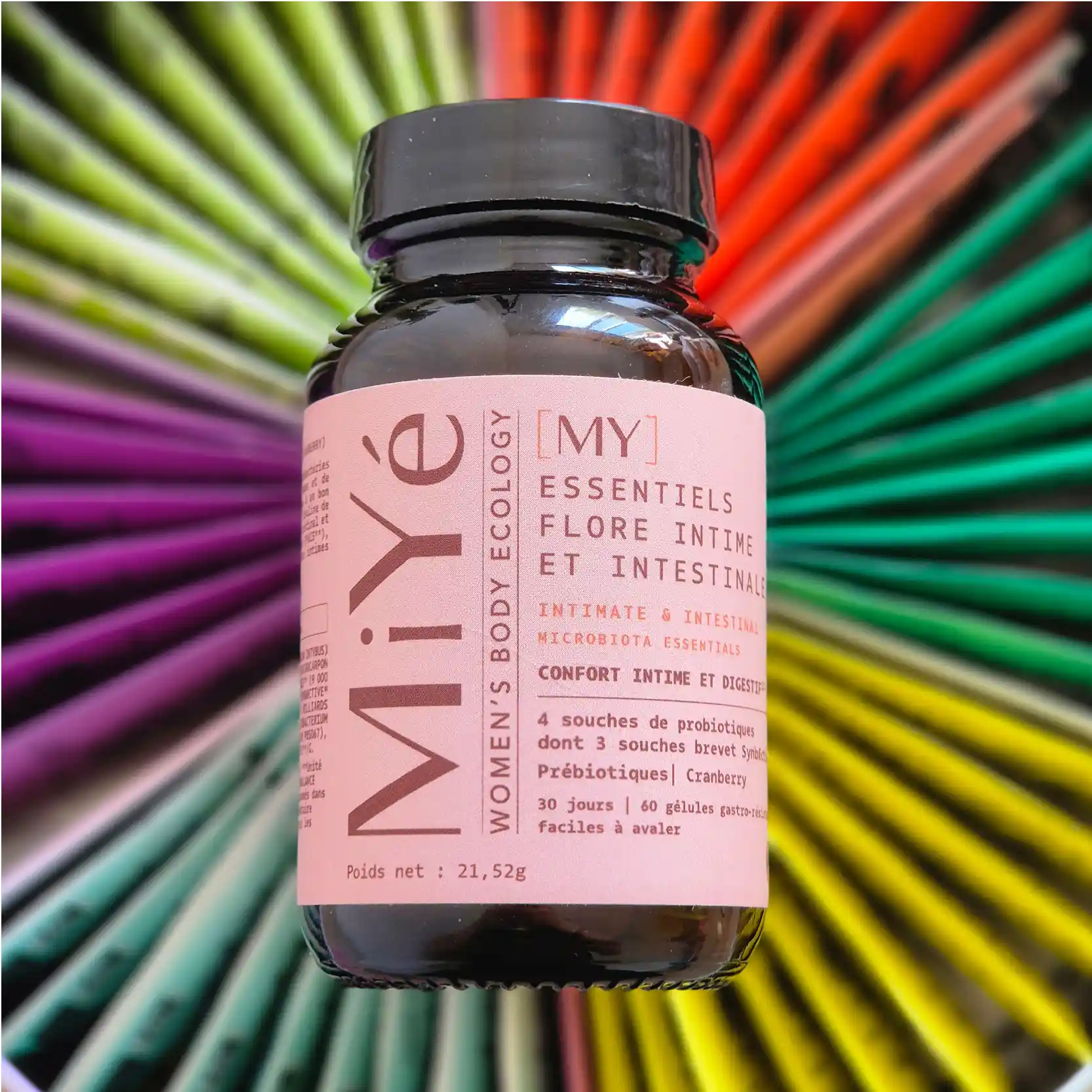4 souches probiotiques ciblées (dont L. rhamnosus, L. plantarum, B. lactis, L. acidophilus) capables de coloniser naturellement la flore vaginale et intestinale, renforçant leurs défenses et maintenant un pH intime optimal.