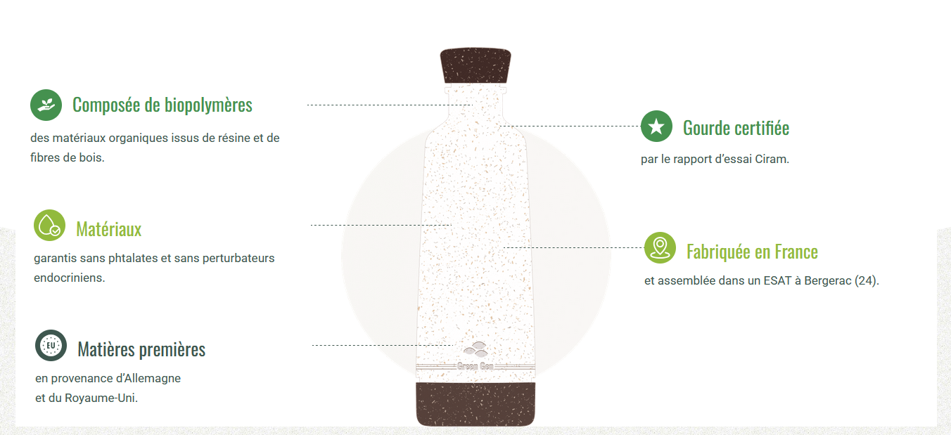 La gourde Green Gen est une innovation écoresponsable, conçue et fabriquée en France par Green Gen Technologies. Elle est réalisée à partir de matériaux biosourcés, alliant des fibres de bois et une résine végétale, offrant ainsi une alternative durable aux gourdes en verre, aluminium ou plastique.
