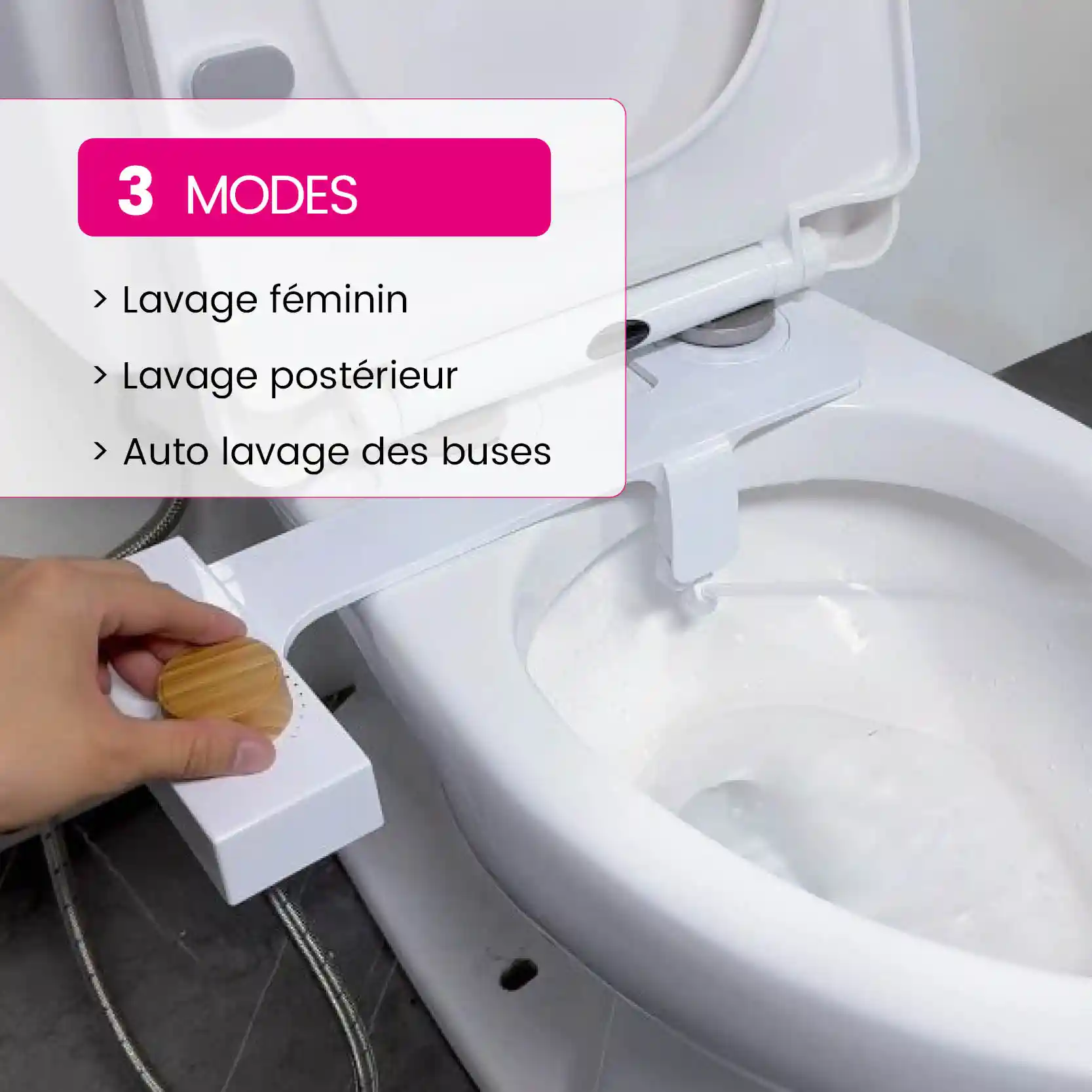 Choisissez simultanément la pression de l’eau et la zone à laver grâce à 3 modes :
