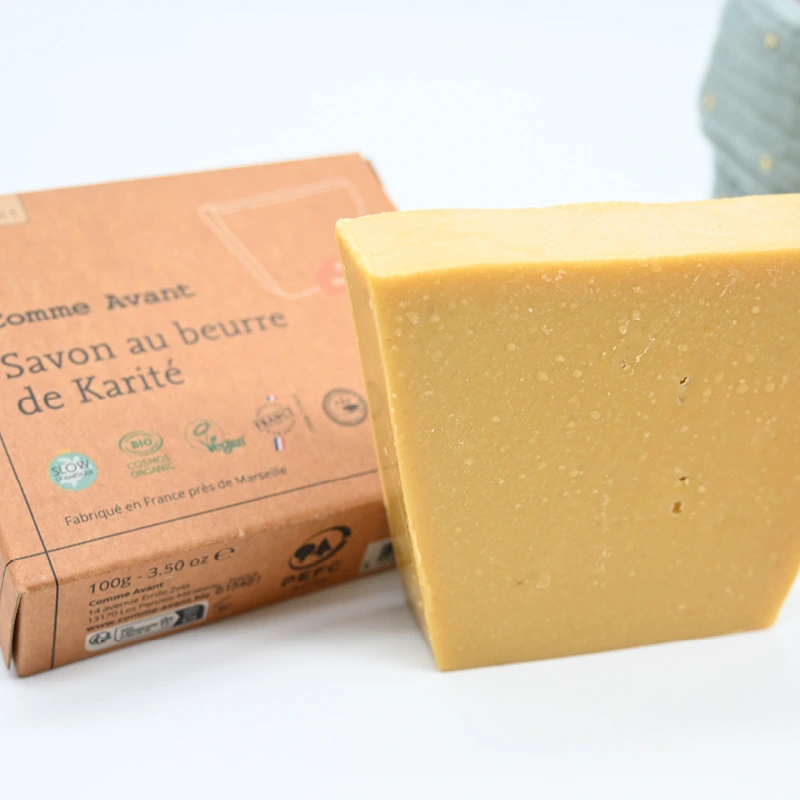 Savon « Comme Avant » : produit solide destiné à un usage sur la peau. Plusieurs formules sont disponibles selon vos préférences.