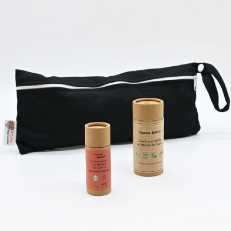 Découvrez ce coffret composé de trois produits pour tester les cosmétiques solides : un parfum solide et un déodorant solide de la marque Comme Avant, accompagnés d’une pochette multifonction imperméable.