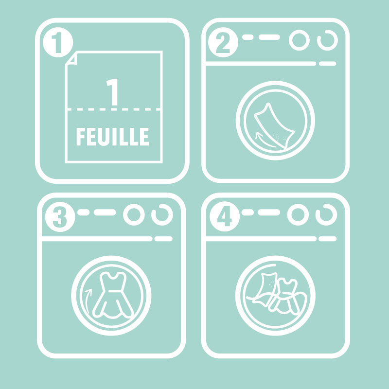 Lave-linge Hublot : 1 / Prenez 1 feuille Floc. 2/ Placez-la dans le tambour vide de la machine à laver. 3/ Mettez votre linge dans la machine. 4/ Lancez votre programme.