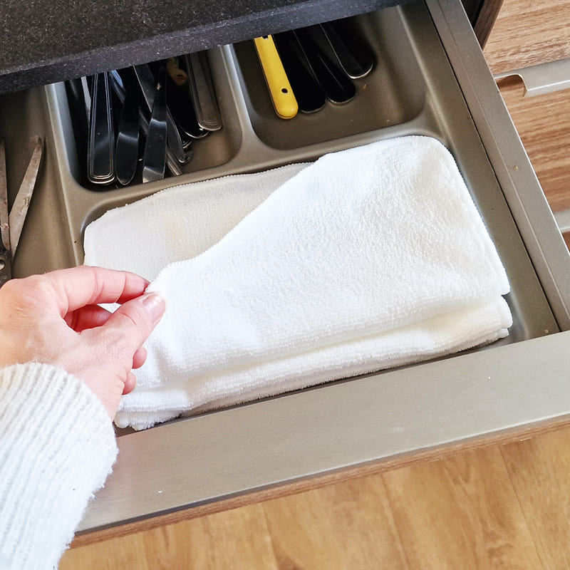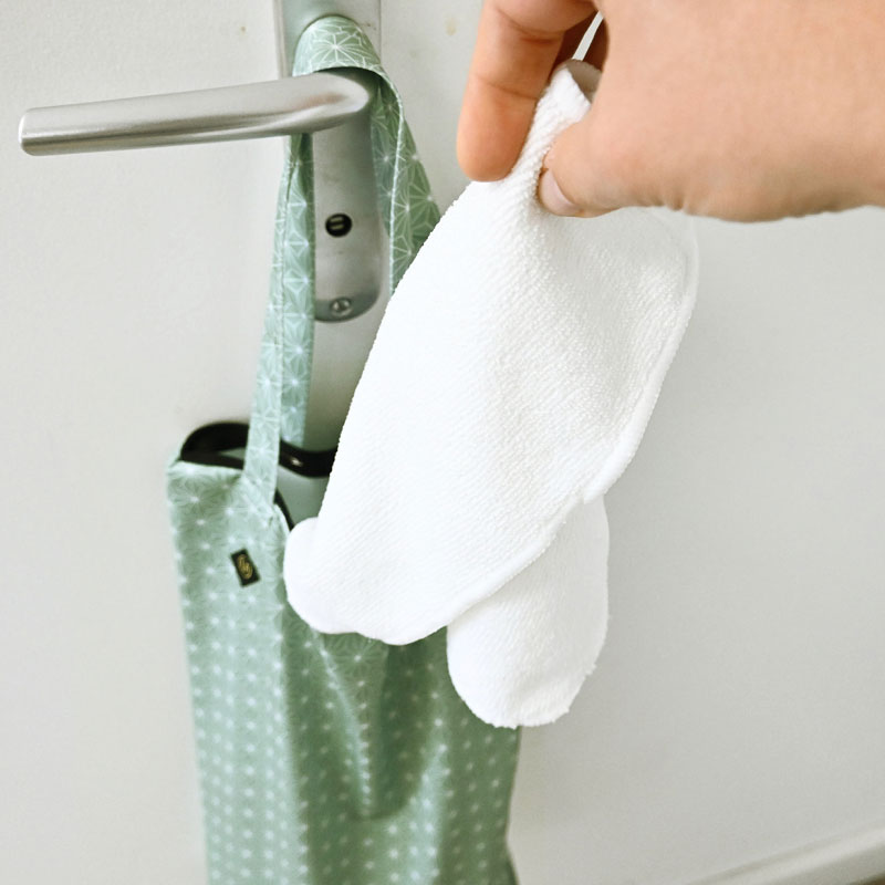 La clé pour faire adopter ce nouveau geste à toute la maison : la logistique. Nous vous conseillons de mettre vos essuie-tout lavables à disposition dans un petit panier sur le plan de travail ou bien dans un tiroir de vos meubles de cuisine. Une fois utilisée, prévoyez un endroit pour les stocker : un panier ou un joli sac de stockage suspendu à une poignée de porte ou de tiroir.