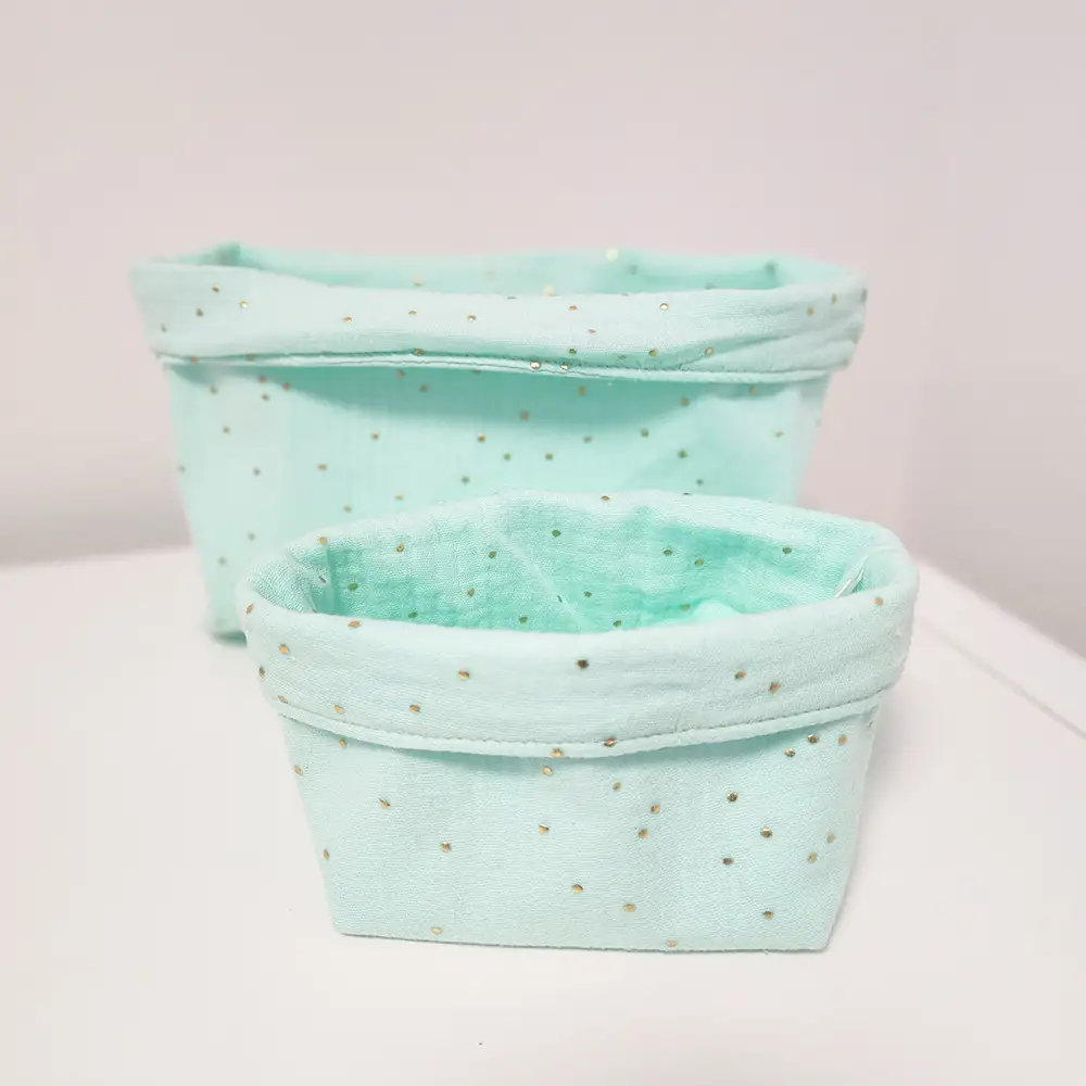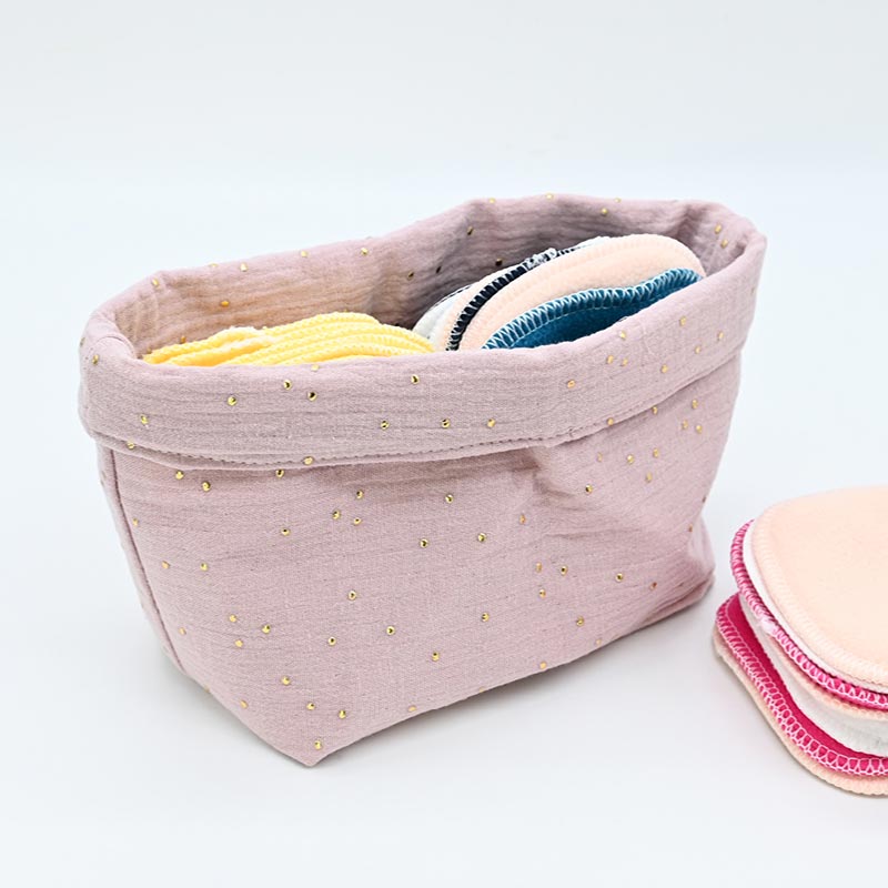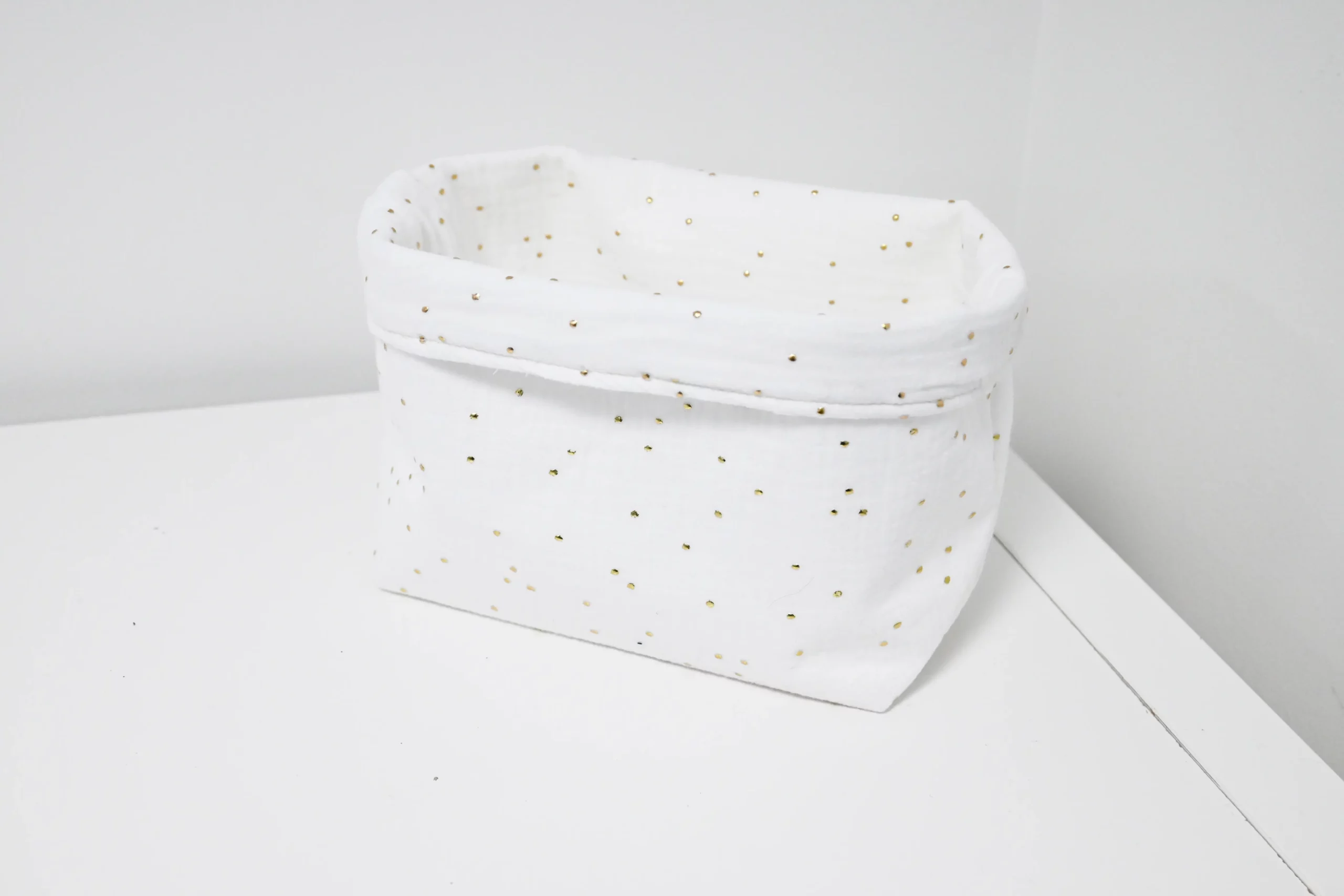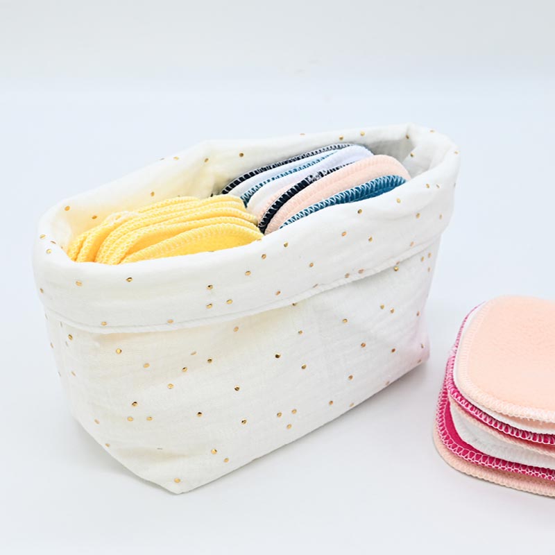 Ces panières à pois dorés sont idéales pour organiser vos tiroirs ! Parfaites pour ranger des lingettes lavables pour bébé ou des cotons démaquillants, mais aussi vos produits de beauté et votre skincare routine, elles gardent vos essentiels bien ordonnés.