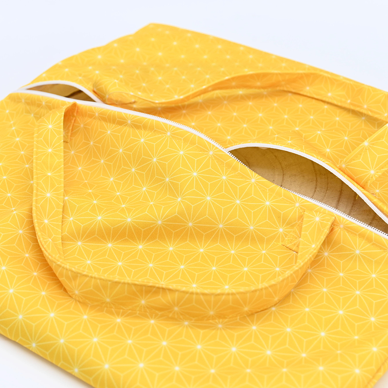 Il possède deux anses solidement cousues et se ferme par deux liens. Il est lavable en machine.
