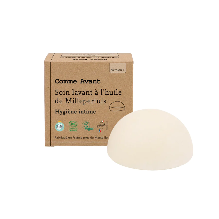 Un nettoyant intime tout doux solide pour se laver en douceur. Une formule ultra-douce, sans savon et sans parfum, parfaite pour la toilette quotidienne. Action apaisante et antibactérienne du Millepertuis. Idéal pour cette zone sensible :